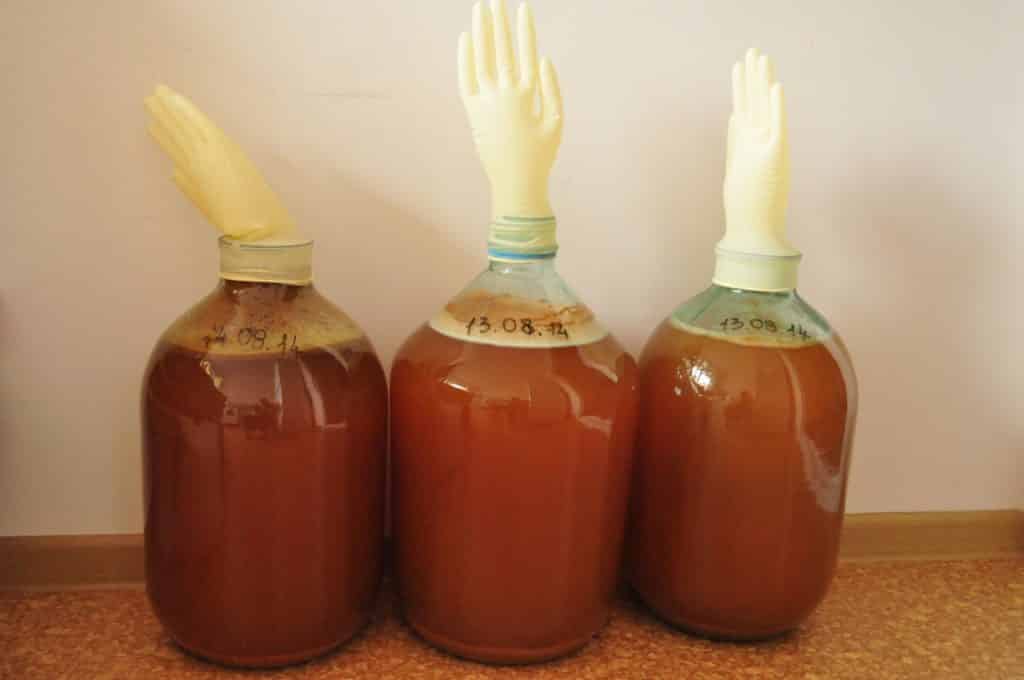 - пришло время закваски. Их необходимо залить небольшим количеством сусла и перемешать до получения однородного раствора. Затем постепенно вливайте в массу смесь дрожжей и сусла, не забывая перемешивать, чтобы дрожжи равномерно распределились в емкости. Закрываем все гидрозатвором и даем 10 дней бродить в теплом помещении.
