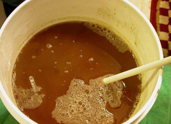 - Как только пшеница вспенивается, добавьте в емкость для брожения 4,8 кг меда и 19 литров воды, все хорошо перемешайте и добавьте полученную закваску