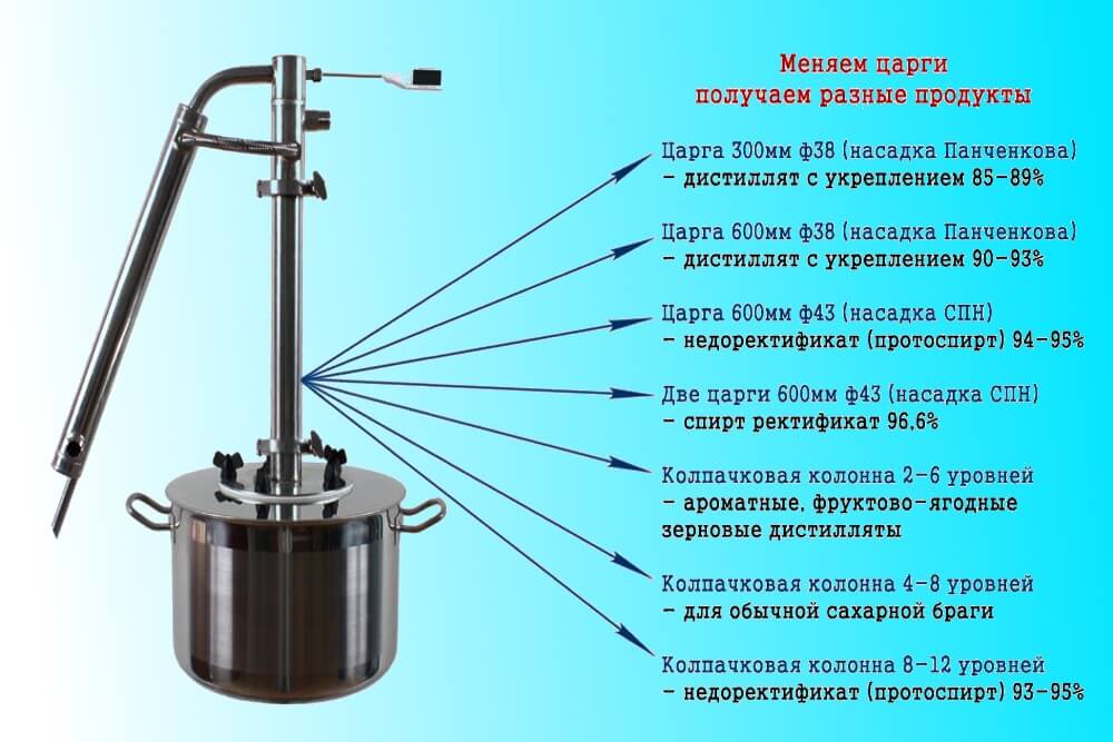 Зарга играет роль сосуда, в котором происходит тепло- и массообмен: пары нагреваются и укрепляют мокроту, спирт очищается и мокрота укрепляется. Фракции разделены и расположены в порядке от низкой точки кипения до высокой точки кипения, чтобы вы могли их выбрать. Диаметр, длина, металл — все влияет на скорость работы аппарата и качество разделения спиртов. Так, например, к шлифовке рекомендуются колонны с высотой боковой стенки 50 см. Чем выше царь, тем больше возможностей разделить и укрепить колонну.