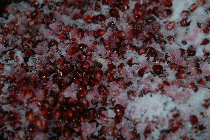 4. Затем переложите гранат в глубокую миску и засыпьте сахаром. Количество сахара зависит от ваших вкусовых предпочтений и сладости самого фрукта. Ложкой или пюре слегка надавить на зерна, чтобы гранат начал заливать сок. Оставьте зерна в сахаре на 7-8 часов или на ночь.