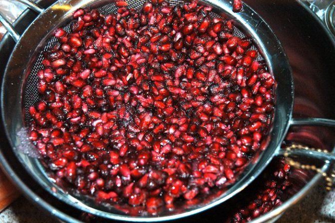 - Через 2 минуты работы агрегата зерна превращаются в гранатовый сок с косточками. Его процеживают через дуршлаг, накрытый тканью, и переливают в небольшую кастрюлю.