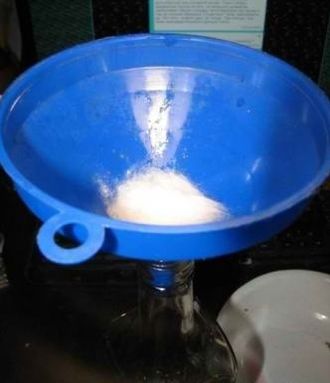 - Берём соль в пропорции 1 столовая ложка на 1 литр самогона и высыпаем в дистиллят.