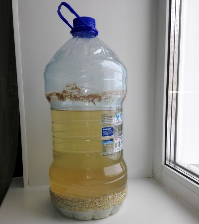- Мокрый горох, готовые дрожжи и оставшуюся воду добавляем в бродильную ёмкость. Ставим гидрозатвор и убираем в тёмное место на 5–7 дней.