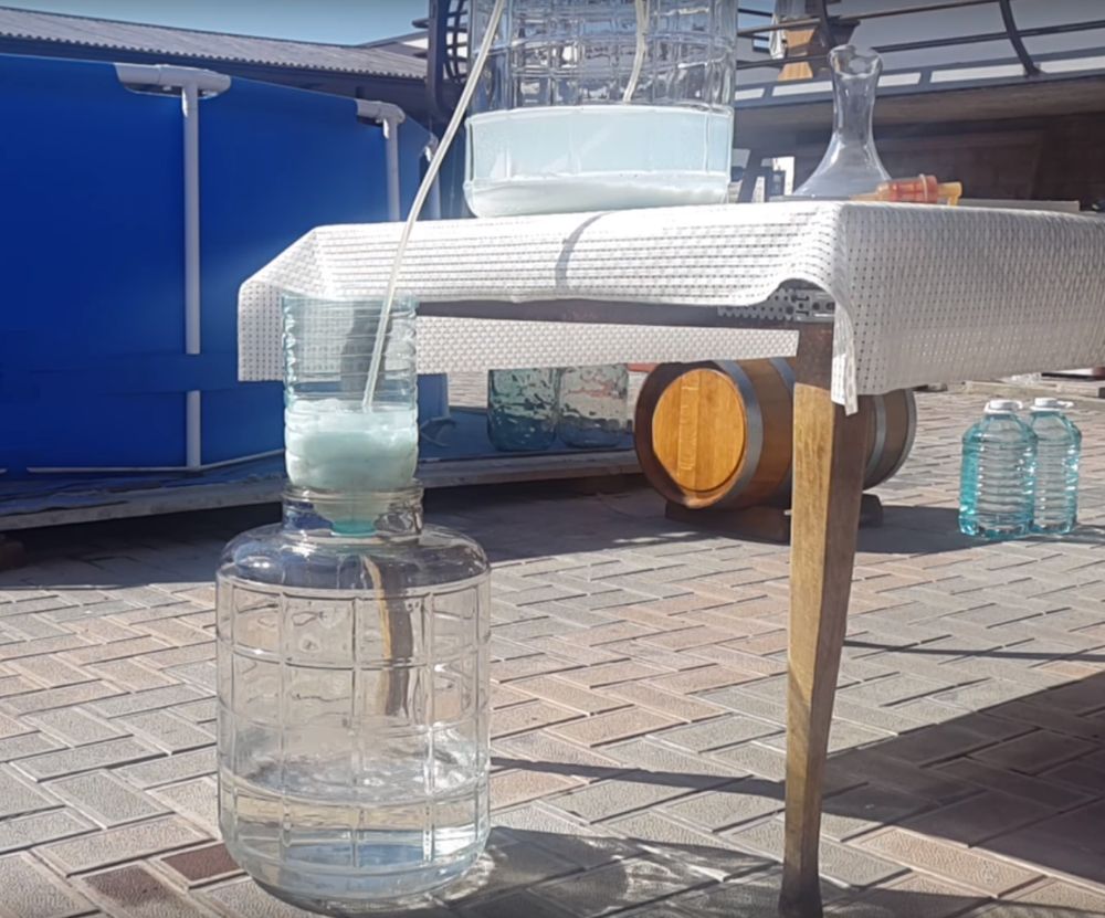 - Снимаем дистиллят с осадка и смешиваем с водой до получения 20% крепости.