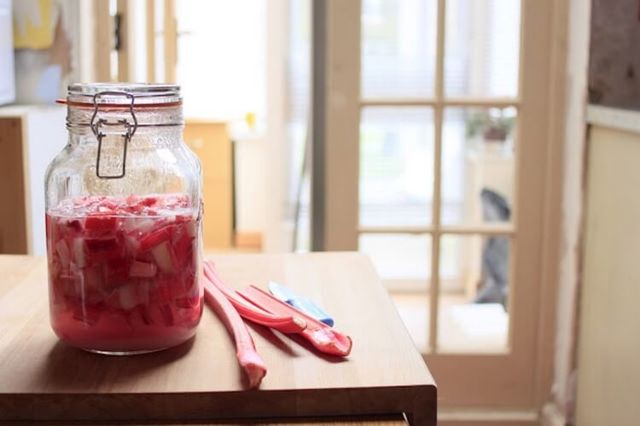 - Черешки ревеня промыть, нарезать небольшими кусочками (примерно по 2-3 см), поместить в банку подходящего объема и слегка подавить деревянной ложкой или пестиком.