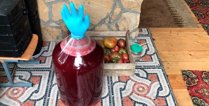Полученный таким образом сок переливается в банку для дальнейшего брожения. Заполните не полностью, оставив немного места. Затем на 8 литров полученного сока положить 1 кг сахара и хорошо перемешать. Теперь надеваем резиновую перчатку, не забывая протыкать ее, ставим в теплое и темное место для брожения.