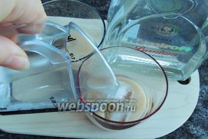- Сначала в специальный бокал наливают водку с кофейным ликером и добавляют лед.