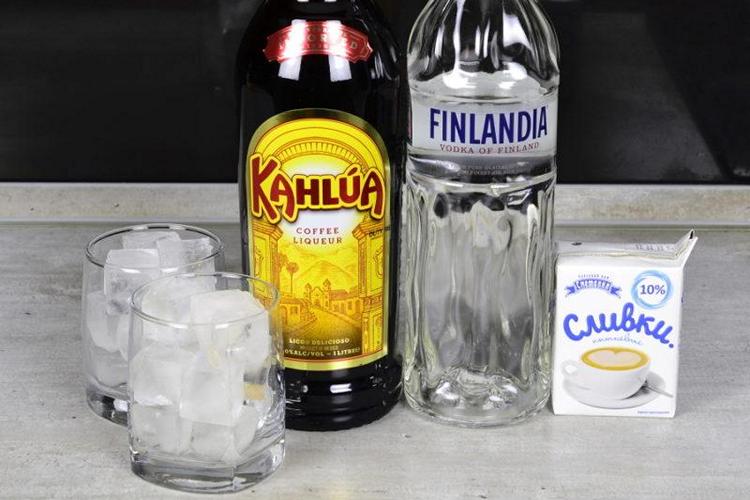 Подготовим ингредиенты: водку, кофейный ликер, сливки жирные или молочные (как вариант), лед.