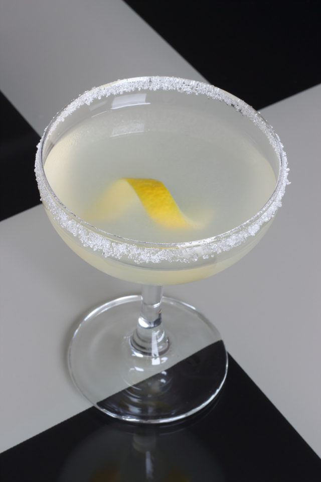 - Напиток переливается в бокал, украшается цедрой лимона, «заправляется» двумя кусочками льда.