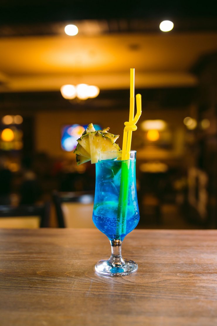 Синий — привычный ликер заменен на «Блю Кюрасао», так получается ярко-сине-голубой напиток.