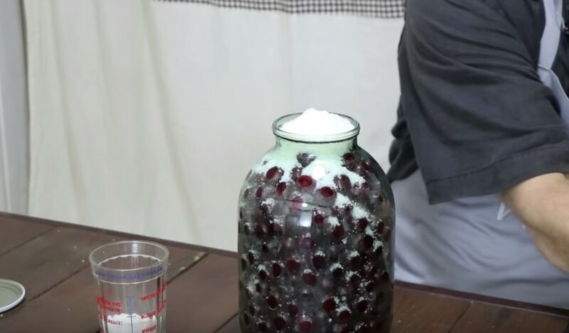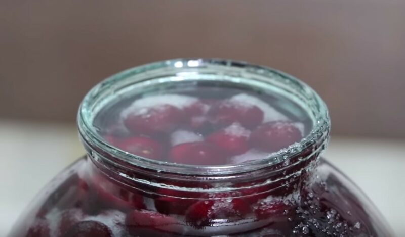 - 3-литровую банку наполовину заполните очищенной семенами сушеной вишни.