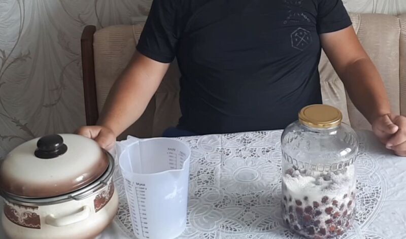 Через две недели достаем банку и процедим жидкость. Переливаем в отдельную емкость и оставляем пока, а ягоды присыпаем сахаром и встряхиваем, чтобы все перемешалось.
