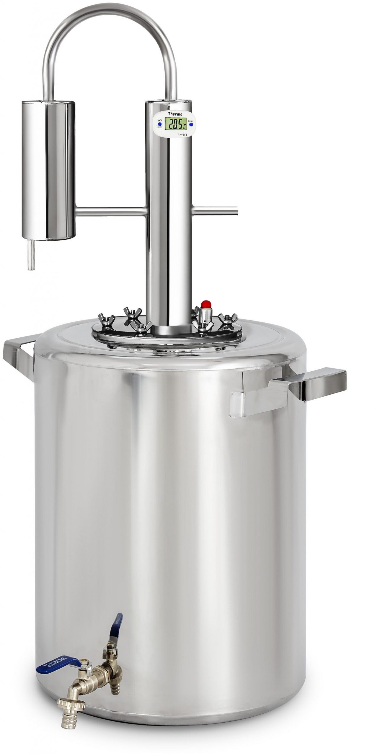 Полное название ПЕРЕГОННЫЙ КУБ ЛЮКСТАЙЛ 25 Л. С ШИРОКОЙ ГОРЛОВИНОЙ.НА ХОМУТЕ.ДЛЯ КОЛОННЫ 1,5 ДЮЙМА. Перегонный кубик на 25 литров на базе котла «Люкстайл» (Luxstahl) из нержавеющей стали. Трехслойное дно — подходит для индукционных плит . Диаметр горловины 345 мм,Диаметр дна 320 мм,Высота без крышки 330 мм,Высота с крышкой 340 мм,Высота с клампом 390 мм.