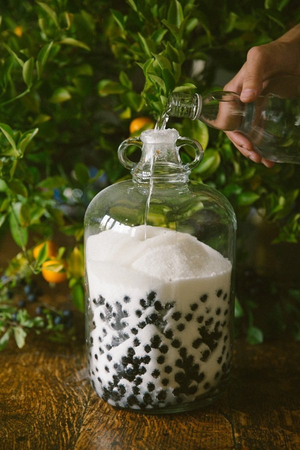 4. По истечении времени добавьте туда же воду и сахар. В рецепте необходимо соблюдать пропорции для 10-литровой банки на 1 кг сахара и примерно 3-4 литра мякоти черной черноплодной рябины.