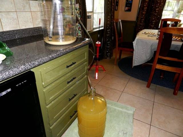 Туда же отправляем сусло на брожение. Темный и теплый, с температурой 18-26 градусов. На пятый день добавить в сусло оставшийся сахар и тщательно перемешать. В среднем фаза активного брожения длится 1-2 месяца. О том, что она закончена, будет свидетельствовать отсутствие пузырьков в гидрозатворе или упавшая перчатка.