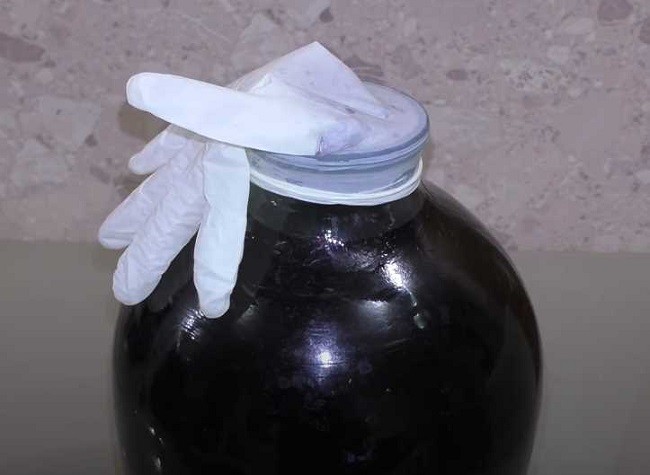 - Надеваем на горло медицинскую перчатку и делаем прокол в одном из пальцев иглой. Емкости с молодым вином ставим в темное место. В начале брожения перчатка набухнет.