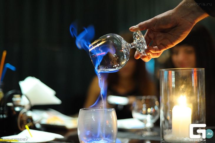 - Ассистент подносит зажженную спичку к полости рта и поджигает спиртное.